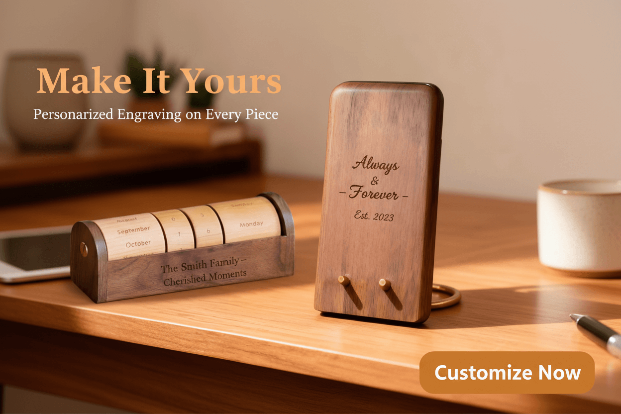 Custom engraving gift guide: Why personalized gifts create lasting memories. Features 8 engravable products - Personalized Orbit, Capybara, Perpetual Calendars, Panda Sculpture, Phone Stand, Brass Top, Owl Spinner. Free engraving...