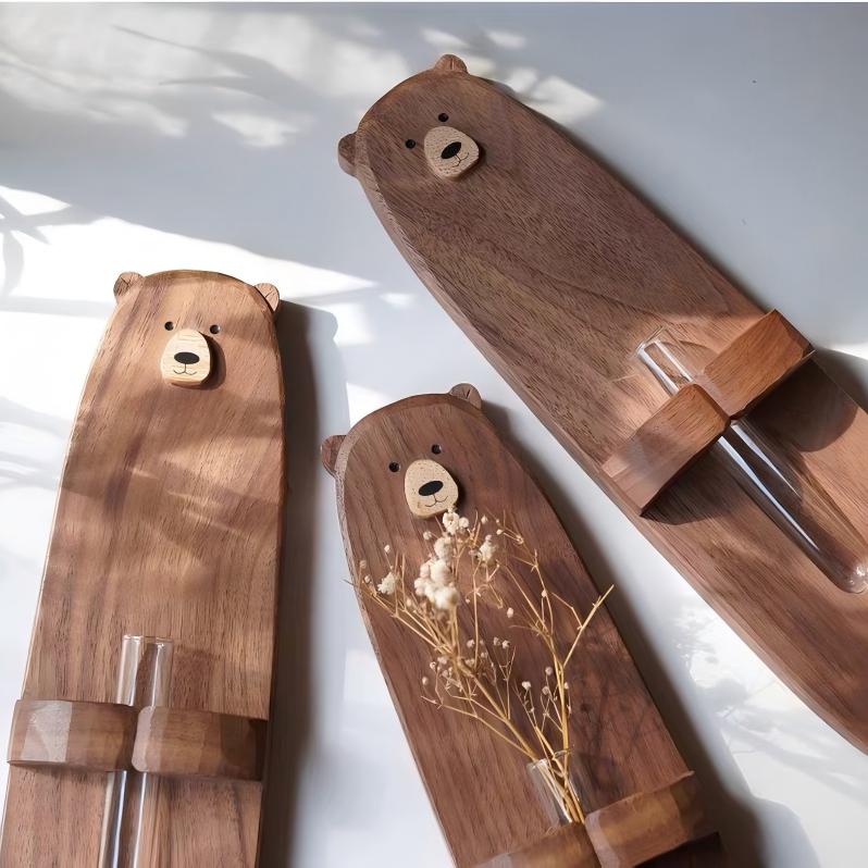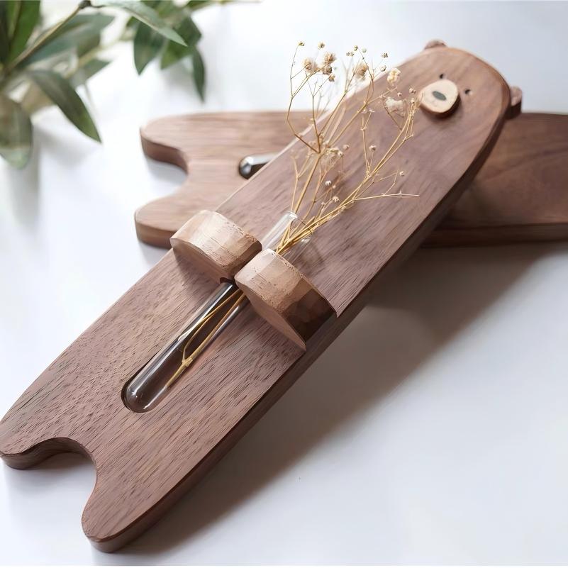 Wooden Bear Flower Vase | Glass Test Tube Planter | Desktop Decoration | Fridge Magnet Gift